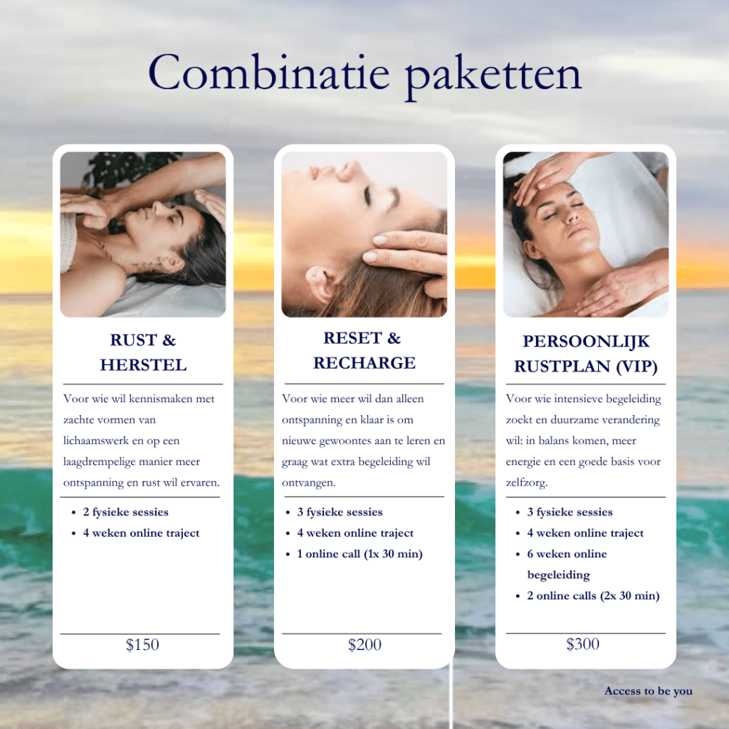 Before your first session, we always start with an intake conversation. This can take place over the phone, via WhatsApp, or directly before your appointment. During this discussion, we’ll explore your wishes and expectations and determine together which session best suits your needs. It’s also an opportunity to assess whether I’m the right person to support you on this journey.